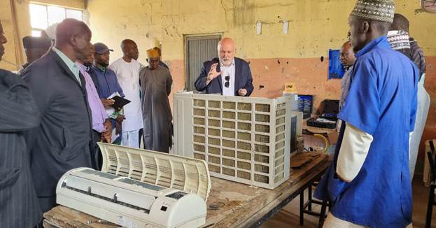 UNEP-U4E’s Waste Electrical and Electronic Equipment expert (middle) instructing technicians and engineers on end-of-life management of Air Conditioners during a workshop at Government Technical College, Kano State, Nigeria.